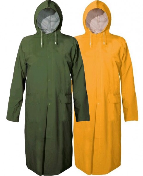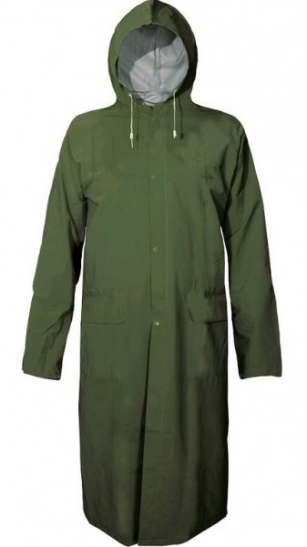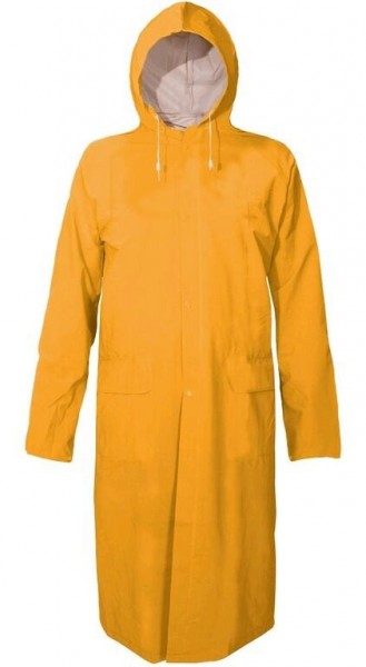 Ochranný nepremokavý plášť s kapucňou. Tento výrobok je vyhotovený z polyesterovej tkaniny, povrstvené zmäkčeným PVC, švy podlepené.